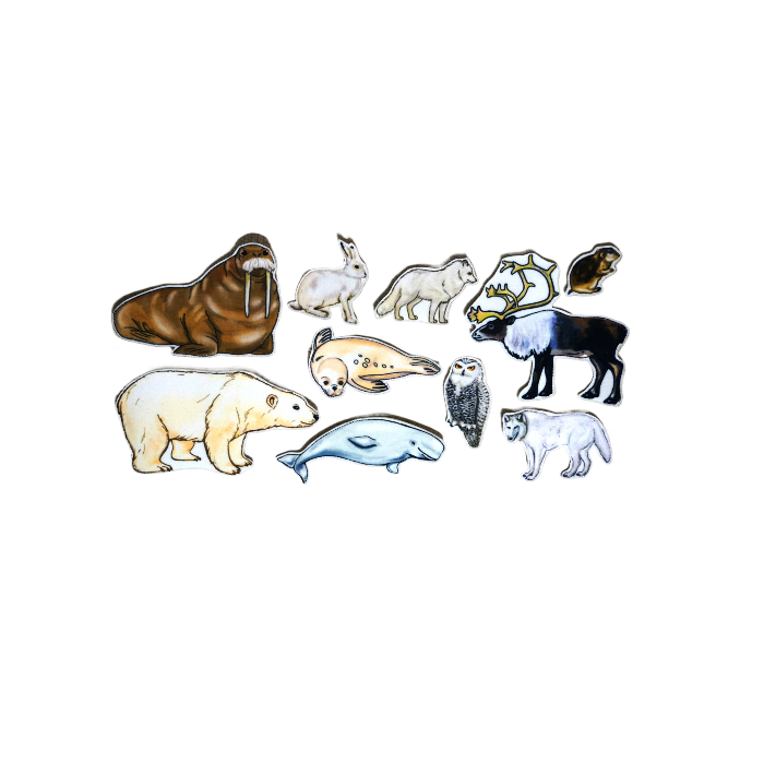 В набор входят: белый медведь, морж, тюлень, песец, полярный волк, полярная сова, лемминг, полярный заяц, олень, белуха. Каждое животное снабжено липучкой (лентой Velcro). Данный набор подходит для работы с игровым полем.
