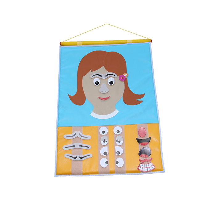 Дидактическое панно увлечет ребенка интересной игрой. «Создать» самому лицо девочки, «попробовать» разные его выражения – это очень интересно! Оно может быть радостным или спокойным, может смотреть в сторону или прямо – вариантов много. Ребенок может поочередно «менять» части лица: глаза, нос, рот, брови. Найти оптимальный, самый симпатичный, по его мнению, вариант получится не сразу. Такая игра знакомит ребенка с выражениями различных эмоций, развивает воображение, зрительно-моторную координацию, моторику рук.