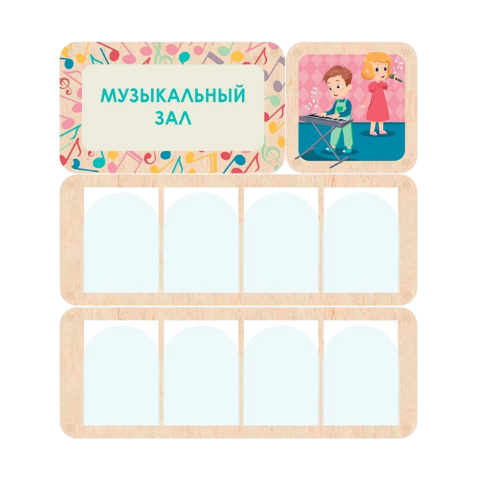 Стенд информации для детского сада, который рассказывает детям и родителям важные сведения о работе музыкально зала. В акриловых карманах можно разместить документацию, расписание занятий, правила и многое другое. Яркий заголовок акцентирует внимание посетителей на этой информации.
