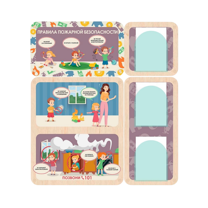 — Обучение правильному поведению с огнём. Стенды по правилам пожарной безопасности помогают детям развивать знания, необходимые для предотвращения возникновения пожароопасных ситуаций и эвакуации в случае опасности. Стенды являются постоянным и видимым напоминанием детям о правилах пожарной безопасности. А повторение правил и воспроизведение их в памяти помогает малышам поддерживать актуальность знаний.