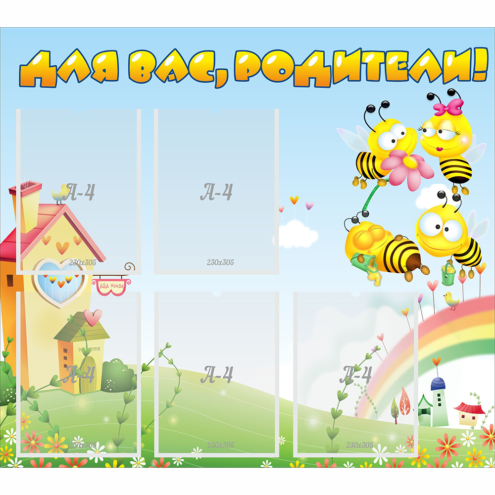 Яркие краски, сочные цвета и интересные картинки, можно не поверить, что речь идет об информационном стенде для родителей, но это так. Как и любой другой предмет в детском саду, он должен быть пропитан детством и сказочностью, даже если предназначен для размещения информации для родителей. Стоит заметить, что стенд сделан крайне практично, имеет несколько кармашков, в которые удобно помещать информацию. Прочный и надежный материал является гарантией долгой службы данного стенда, а специальное ламинированное покрытие защищает краску от воздействия. Украсьте свой сад таким оригинальным стендом, и родители будут впечатлены таким замечательным вкусом и стилем.