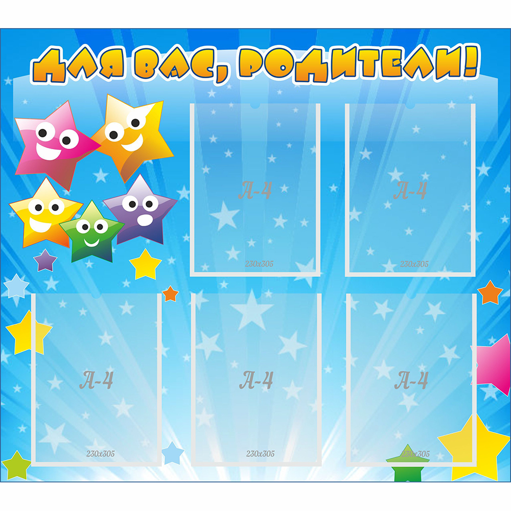 Веселые звездочки станут настоящими друзьями для малышей. Они подарят детям улыбки и хорошее настроение. Главные элементы дизайна – цветные звезды. Родителям будет интересно узнать про расписание занятий в группе, их ежедневной тематике, о режимных моментах и других объявлениях. Стенд  привлекая внимание, как взрослых, так и детей, доносит информацию до адресата. К тому же он сделан из качественного и прочного материала, поэтому прослужит долго и надежно. Специальное покрытие защищает краску, его удобно разместить на любой поверхности.