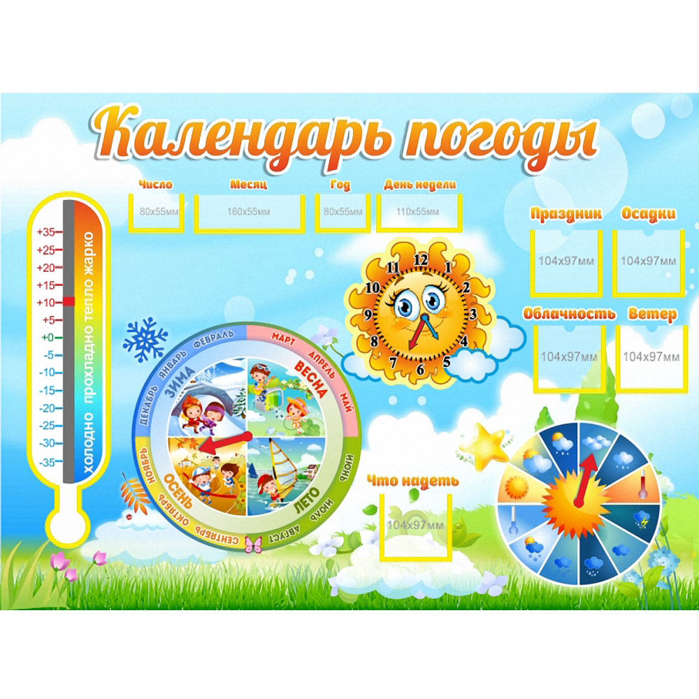 Не все детки могут похвастаться своим умением различать погоду, особенно детки младших групп. И, конечно же, этому нужно их научить, и проще сделать это с помощью данного замечательного стенда, которые имеет все необходимые слова и картинки для того, чтобы детям было проще научиться различать времена года и погоды. С таким стендом научить можно проще простого, главное это приложить немного усилий и воспользоваться информацией на стенде. Яркие и красочные картинки прекрасно показывают виды погоды, чтобы детки могли максимально точно ее узнавать. Это прекрасное приобретение для каждого детского садика.