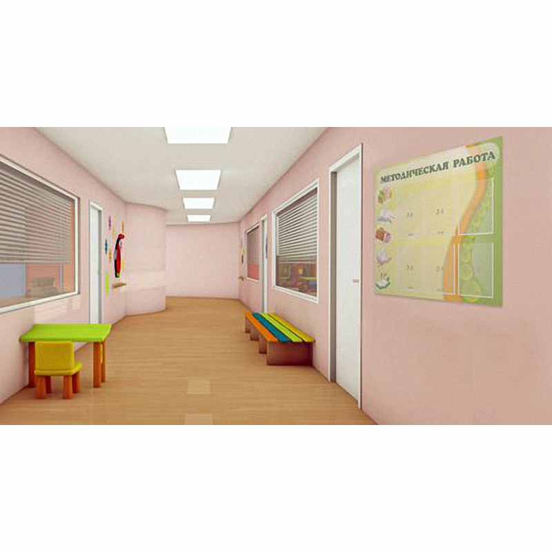 Фон стенда выполнен в необычном дизайнерском решении. Заголовок «Методическая работа» написан буквами темно-зеленого цвета на слегка видимом фоне белого цвета. Заменить информационный лист можно через верхнюю центральную часть кармана. Детей привлечет этот стенд интересными картинками. Малыши смогут отыскать на стенде записную книжку, блокнот, перо с чернильницей, множество книг с разноцветными обложками. Информация, размещенная на стенде, будет полезна в работе педагогов. Можно рассказать о роли конструктивных игр в жизни дошкольников, о правилах поведения в детском садике, необходимости творческого развития детей.