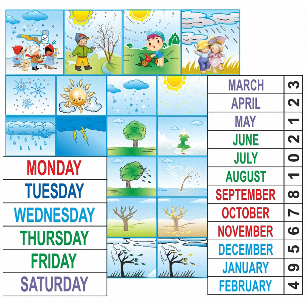 Предлагаем Вашему вниманию отличное наглядное пособие для дошкольных учреждений с изучением английского языка. Данный стенд создан для эффективного привлечения внимания каждого ребенка, чтобы они запомнили английские названия времен года, дней недели, погоды и другую полезную информацию.