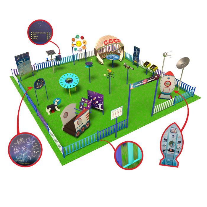 «Детская космическая станция» - это уличный комплекс, в состав которого входят красочные интерактивные стенды и макеты. С их помощью дети осваивают первые азы астрономии.