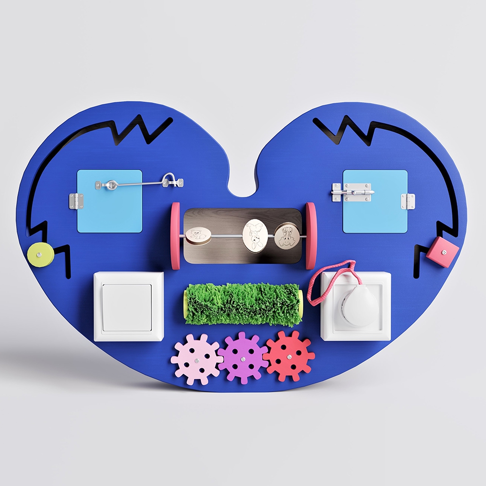 У человека центры, отвечающие за речь и движения пальцев рук находятся близко друг к другу, стимулируя моторику, активизируя соседние зоны, отвечающие за речь. Очень важно начать тренировку пальцев малыша с раннего детства, это гибкий подход и ребенок быстрее сам научится всему. Бизиборд «Большое синее сердце» синего цвета успокаивает и поможет снять напряжение.