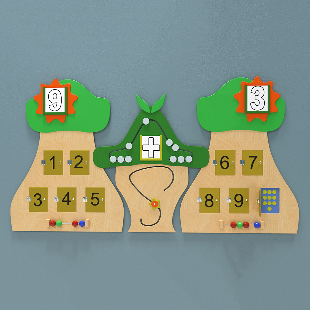 Комплект бизибордов «Обучение счёту» — это тройная деревянная дидактическая панель, основа выполнена в виде трёх лесных грибочков. На поверхности панелей размещены кармашки для сменных карточек с цифрами, подвижные панели с числами от 1 до 10, тактильные лабиринты, счёты.