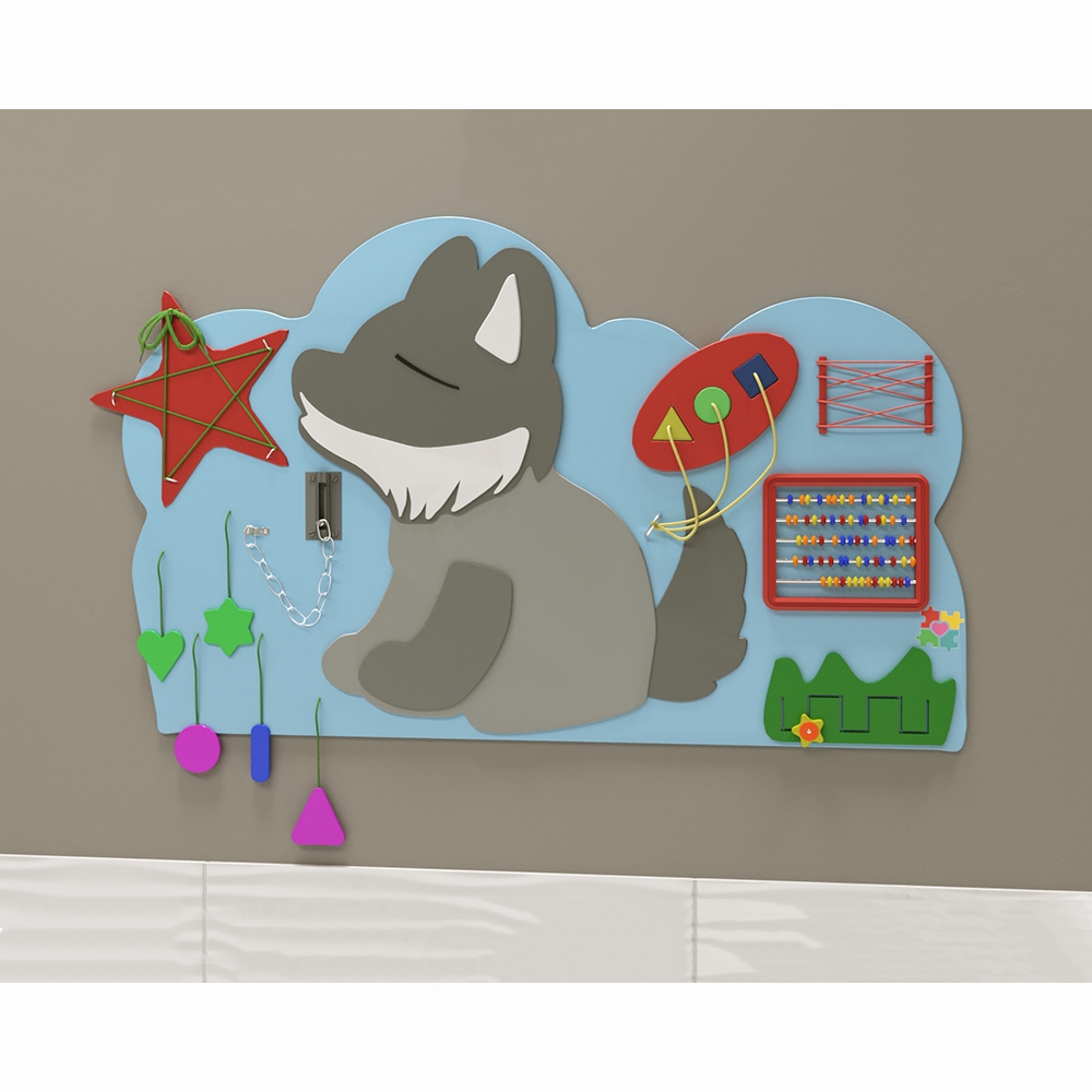 Бизиборд «Волк» — это ценный детский игровой модуль, ведь с его помощью можно не просто занять ребёнка, но сделать это с пользой для его развития. А ещё настенную панель легко расположить в небольшом помещении благодаря компактному исполнению, что выгодно отличает её от объёмных аналогов. Поверхность обработана специальным образом и имеет многослойное покрытие из экологически безопасных материалов.