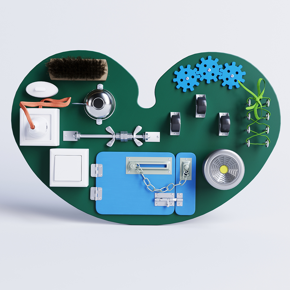 • Покажите ребенку разные материалы доски: дерево, металл, ткань, рассказывая, где можно встретить подобные детали. Так ребенок быстро расширит словарный запас, а главное, научится различать твердое от мягкого, шершавое от гладкого, холодное от теплого.