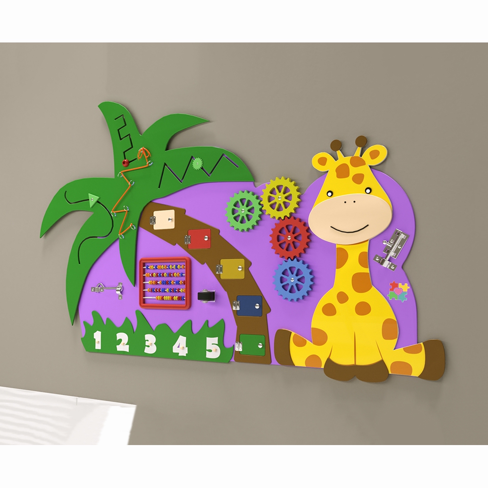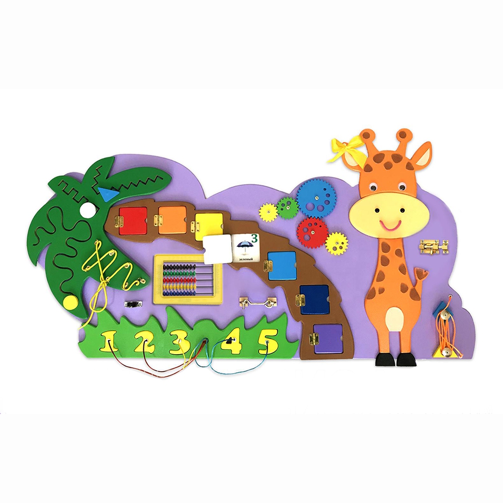 Бизиборд «Жираф»оптимальное решение для небольших помещений, потому что он сохраняет игровую ценность и экономит пространство. Основа выполнена в виде фиолетового облачка, на котором размещён весёлый Жирафик, пальма и полянка с зелёной травкой. Все края закруглены и обработаны по специальной технологии, что гарантирует безопасность в использовании даже самыми маленькими детками.