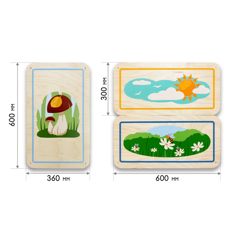 Дополнительные модули бывают однотонные и с тематическими иллюстрациями, подходящими под тематику дидактических панелей. Разнообразие размеров способствует декорированию стен различной конфигурации и масштабов. Параметры варьируются от совсем маленьких модулей 300х300 мм до крупных размеров 600х600 мм.