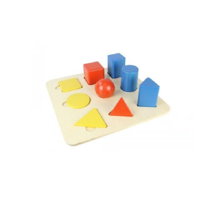 Панель выполнена из березовой фанеры, на поверхности которой имеются углубления, в которые вставляются плоские и объемные цветные геометрические фигуры, изготовлены из массива бука. Пособие способствует развитию моторики, познавательных навыков и логического мышления.