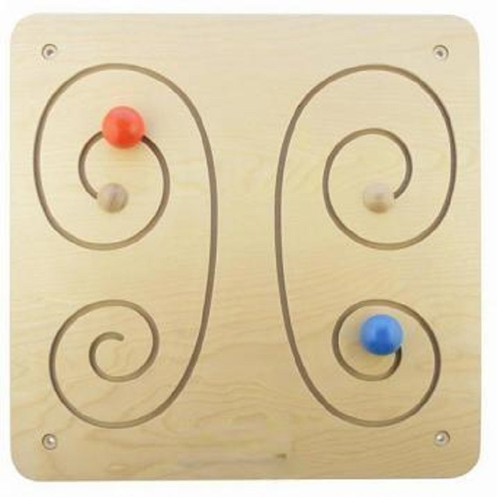 На лицевой поверхности панели имеются 2 прорези-углубления - лабиринты в виде крыльев бабочки, в прорезях подвижно закреплены 2 шарика красного и синего цвета, в начальной точке лабиринтов - прорезей имеются заглушки для изъятия шариков. Общий размер 46х46 см. В скользящем лабиринте в форме бабочки используются противоположные кривые со спиралями с отражающей симметрией, создающие эффект крыла бабочки. Дети могут одной рукой обвести форму одной кривой, а затем повторить это отдельно другой рукой, переходя к использованию обеих рук одновременно. Это поможет улучшить координацию левой и правой руки.