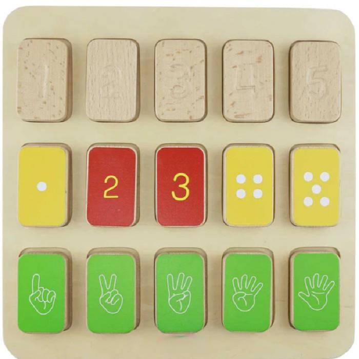 Учебная доска 1-5 с 15 плитками с числами. Числа 1-5 представлены арабскими цифрами, жестами, точками, счетными метками, выгравированными цифрами и драгоценными камнями. Дети могут изучать различные способы представления чисел за одно обучение.
