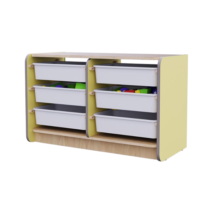 Двойной модуль для хранения игрушек создан для организации пространства в игровой комнате детского сада. Укомплектован 6 пластиковыми ящиками, полностью вынимающимися из полозьев, что помогает поддерживать порядок и чистоту в ДОУ.