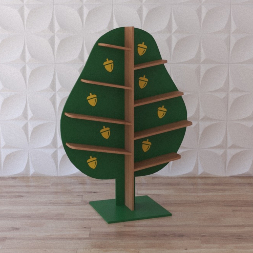 Экополка «Могучий дубок» исполнен в форме деревца дуба и является составляющим элементом набора экополок “Волшебный лес”, который представляет из себя набор модулей из натуральной древесины, в его составе всего 3 полочки в форме деревцев – дубочек, ёлочка и яблоня; полочки окрашены в тёмно-зелёный цвет, а над полочками-веточками изображены жёлуди, яблочки и шишечки. Этот комплект может выступать в качестве игрового модуля для групп в садиках и яслях (для хранения игрушек) или э кополка «Могучий дубок» может быть отдельным модулем системы хранения.