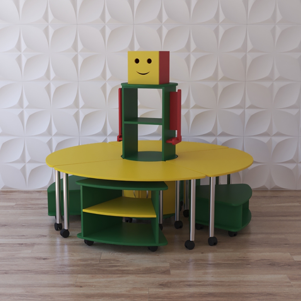 Модульный стеллаж “Весёлый робот” станет отличным решением для небольшого помещения и групповых занятий с дошколятами. Его компактная конструкция позволяет хранить большое количество учебного и игрового материала на маленькой площади, а ещё в комплекте имеются учебные столы для дошколят. Оригинальный дизайн станет прекрасным украшением в помещении.