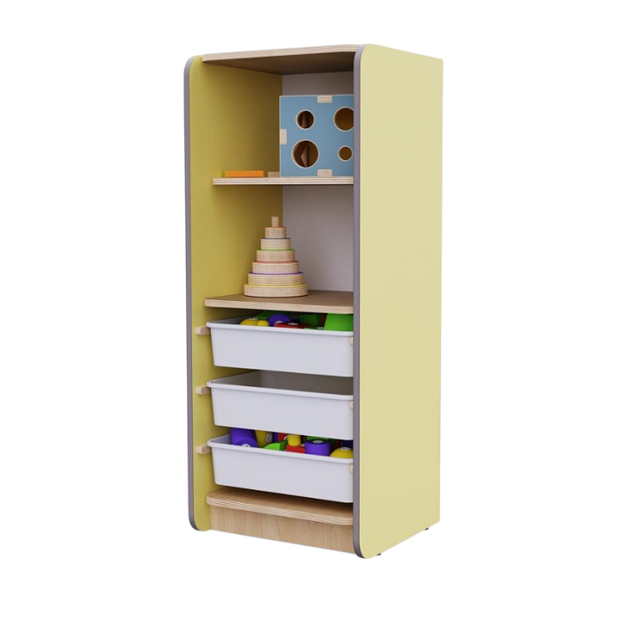 Открытый шкаф с двумя полками и тремя пластиковыми ящиками для оснащения игровых комнат в детских садах и организациях дополнительного образования. Этот открытый шкаф удобен и функционален, с ним легко создать систематизированное хранение и атмосферу порядка в ДОУ.