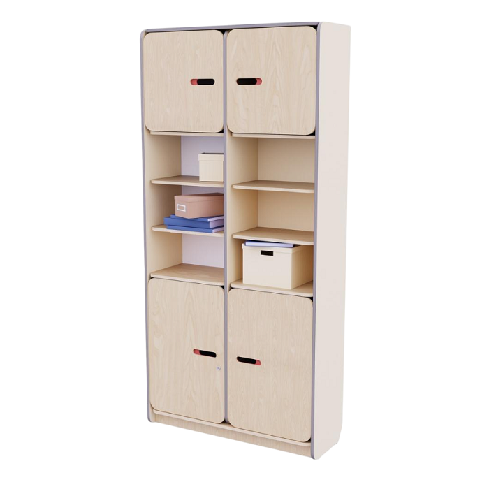 Безопасность: Конструкция стеллажа разработана с учетом всех стандартов безопасности. Встроенные шкафы с дверцами обеспечивают безопасное хранение мелких предметов и игрушек, предотвращая доступ к ним детей без присмотра взрослых. Нижняя дверца закрывается на замок для удобного размещения аптечки и других вещей, которые необходимо спрятать от детей.