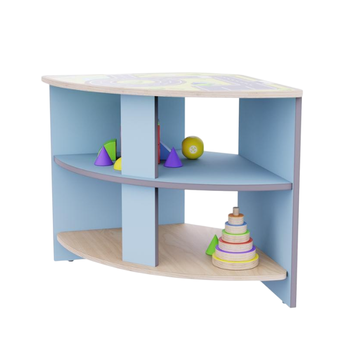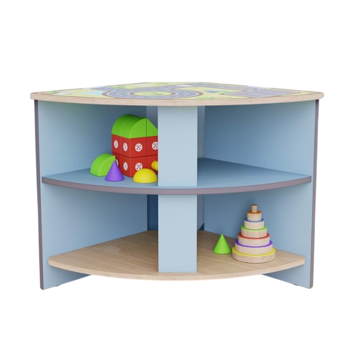 Угловое место для хранения идеально подходит для организации пространства в углах комнаты. Оно позволит эффективно использовать каждый сантиметр и обеспечит удобный доступ к материалам и игрушкам. На верхней поверхности цветная печать с картами дорог и настольной игрой, дети могут использовать ее для своих активностей.