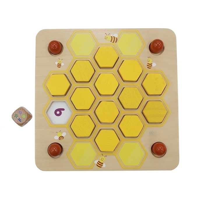 Панель из березовой фанеры выполнена в виде пчелиной соты, состоящей из шестиугольных ячеек. По краям панели расположены колышки, на которые нанизываются карточки с заданиями. Каждая из карточек представлена в различных темах: цифры, буквы на английском языке, геометрические формы, цвета.