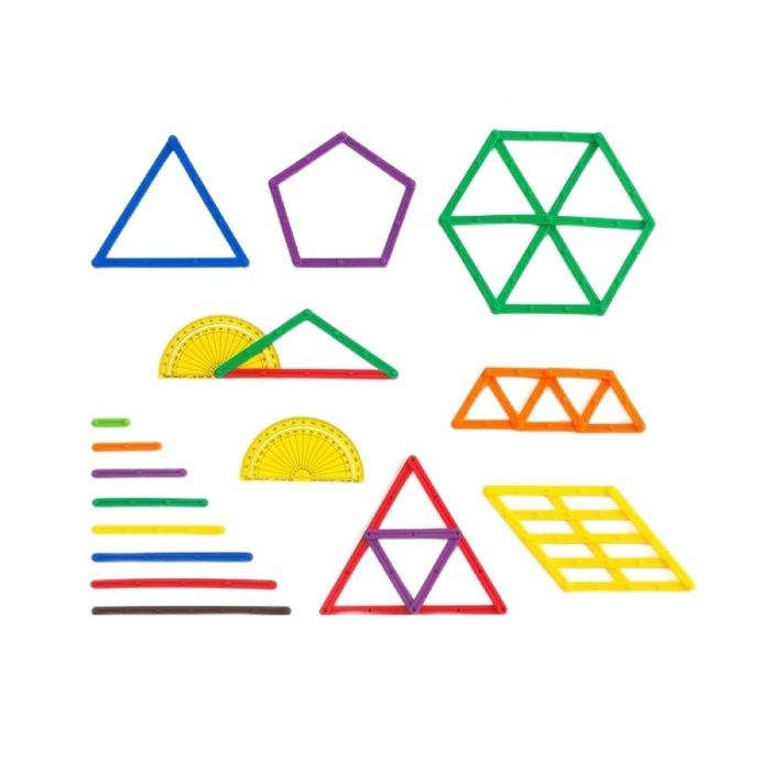 Набор из 80 гибких палочек различной длины, соединяющихся между собой под разными углами, позволит детям изучать планарную геометрию. Дети могут, не отвлекаясь, подолгу упражняться в преобразовании фигур, перекладывая палочки по заданному образцу, по собственному замыслу. В таких занятиях формируются важные качества личности ребенка: самостоятельность, наблюдательность, находчивость, сообразительность, вырабатывается усидчивость, развиваются конструктивные умения. Развитие тонких дифференцированных движений пальцев, развитие соотносящих движений рук. Предложите ребенку выложить из счетных палочек — квадрат, прямоугольник, треугольник, домик, грибок, елочку, лесенку и др. Задания и инструкции к ним могут быть разными по сложности: поэтапный показ каждого действия, выполнение фигуры по готовому образцу, выполнение по памяти.