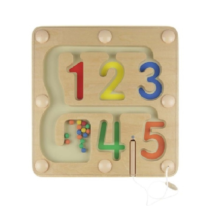 Панель выполнена из березовой фанеры, на лицевой стороне которой расположен магнитный лабиринт. Детям нужно перемещать цветные бусинки с помощью магнитной палочки на веревочке в соответствующие по цвету ячейки в форме цифр.