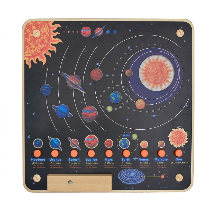 Основание настенной панели выполнено из березовой фанеры, на лицевой части изображена солнечная система. Специальные световые эффекты демонстрируют движение планет. Вокруг изображений Земли и Луны светодиодами выполнена их орбита. В нижней части панели отображены все 8 планет и Солнце. При нажатии на конкретную планету, на верхней схеме загорается нужная планета.