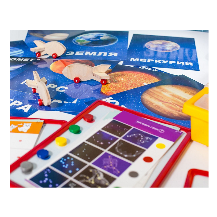 Игровой набор представляет собой напольный коврик с изображением строения Солнечной системы, выполненный полноцветной печатью на виниловой основе, или аналог; макеты космических ракет, выполненные из дерева и снабженные наклейками 4 основных цветов; наглядно-практическое пособие, набор ламинированных карточек с изображением планет и объектов Солнечной системы, видео-контент с обучающими роликами, журнал проекта.