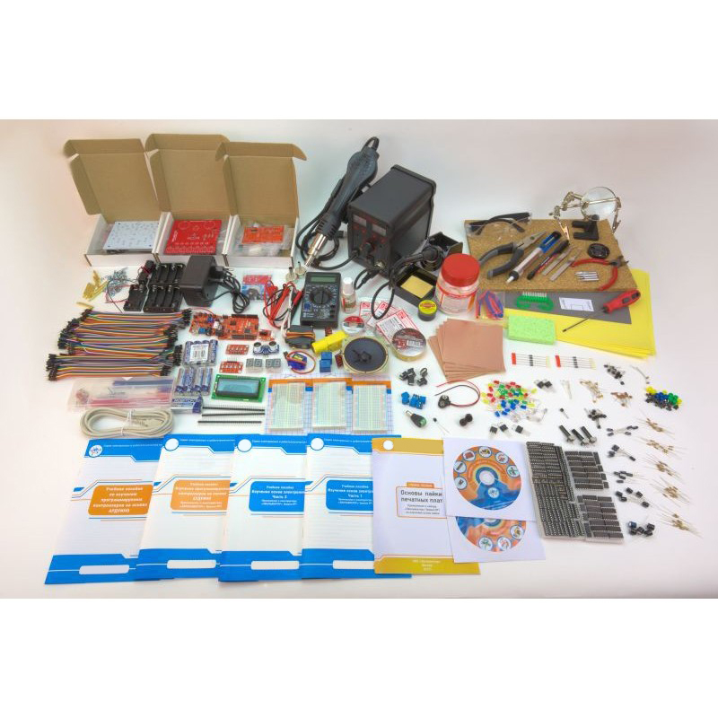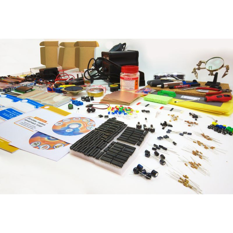 Набор содержит учебный курс по основам электроники. Он помогает шаг за шагом, последовательно, познакомиться с базовыми электронными компонентами, из которых создаются даже самые сложные потребительские электронные устройства. После электронных компонентов выполняется переход к микросхемам, существенно расширяющим поле для маневра творческих замыслов. Конечной же целью курса являются навыки по самостоятельному созданию печатных плат и программируемого контроллера в частности.