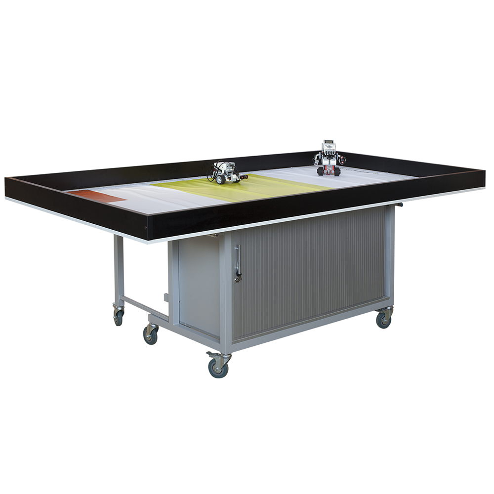 Стол представляет из себя полигон для роботов, на котором учащиеся смогут выполнять задания из учебных пособий. Рабочая поверхность расположена на удобной высоте и ограждена бортами со всех сторон. Размеры испытательной зоны (240х120х10 см) позволяют разместить тренировочные поля для выполнения различных заданий.