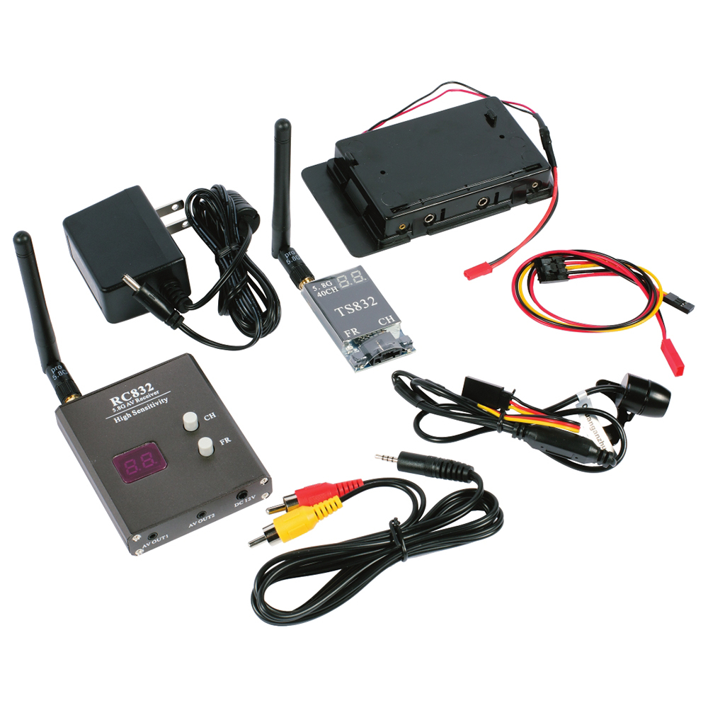 - Поставляется с монтажной опорой для видеокамеры, соединительным кабелем с переходником для аккумуляторной батареи на 9 В, беспроводным приёмником, двумя силовыми адаптерами на 8 В постоянного тока, аудио-видеокабелем и батарейный отсек для аккумуляторов типа АА