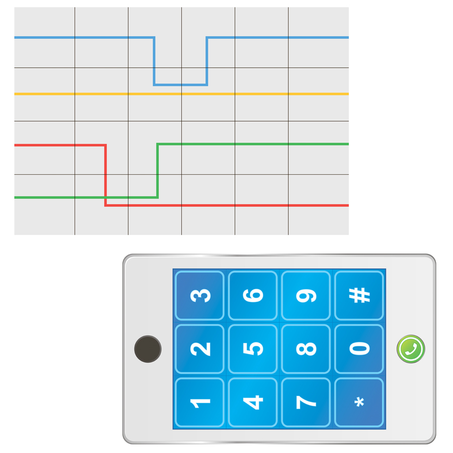 Поле разделено на квадраты, расстояние между центрами которых составляет 150 мм (шаг мини-робота Bee-Bot). На каждой из сторон поле имеет износостойкое покрытие с нанесенными полиграфическим способом красочными рисунками: на одной стороне маршруты движения мини-робота в виде 4-х разноцветных линий: 3-х ломаных и прямой, на другой стороне – изображение передней панели смартфона с полем-маршрутизатором размером 45х60 см в виде телефонной раскладки кнопок от 0 до 9, # и .