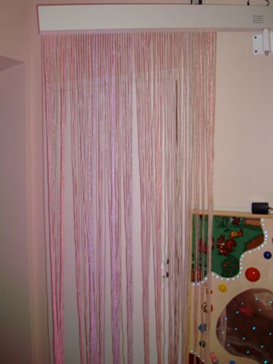 Удобный и практичный способ размещения фиброволокна в сенсорной комнате - каскад фиброоптических волокон, равномерно распределенных по ширине занавеси, создает необычный световой эффект. Занавесь лучше всего разместить в нише или у стены.