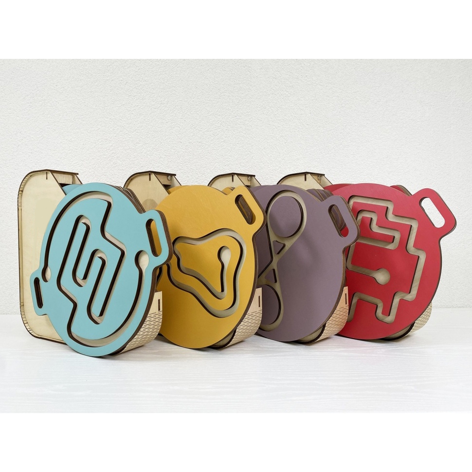 Лабиринты изготовлены из берёзовой фанеры и окрашены стойкими к выцветанию полиуретановыми красками без запаха. Сверху всё покрыто огнестойким лаком Renner.