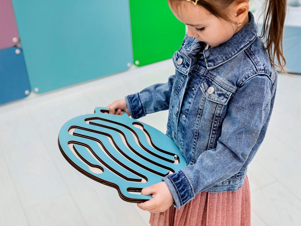 Это игровой тренажёр для развития мозга и координации движений. На круглой доске с двумя ручками по бокам выполнен лабиринт, по которому нужно прокатить шарик с помощью согласованных движений рук.