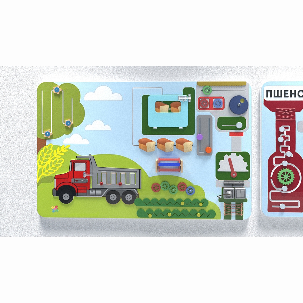 Комплект настенных панелей «Хлебокомбинат» отображает работу настоящего комбината по производству хлебопродуктов и все её этапы – от сбора урожая в поле до транспортировки готовой продукции в магазины. На панелях имеются и другие приспособления для развивающей детской игры.