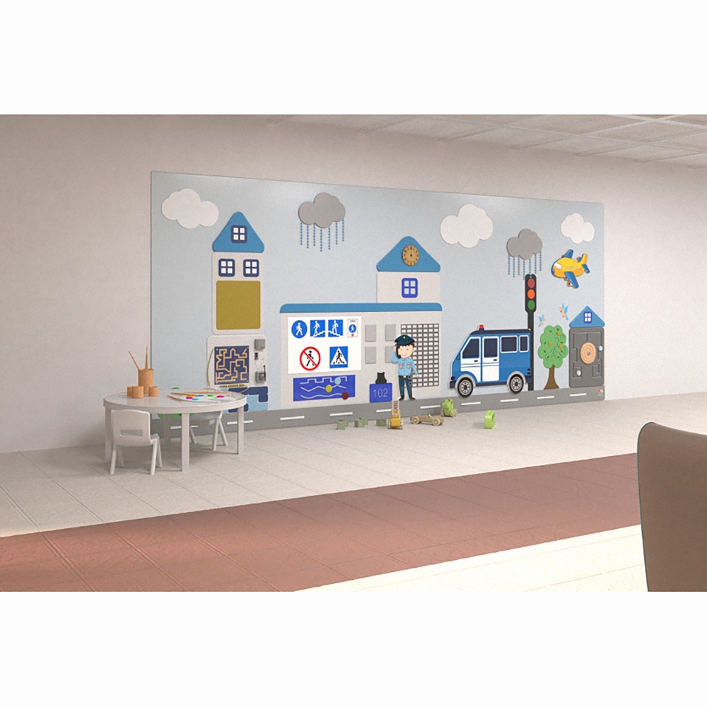 Настенная панель «Полиция» не нуждается в дополнениях и может выступать как самостоятельное оснащение игровой зоны в общественном учреждении (медицинской клинике, банке, кафе, частной компании) благодаря размерам и обилию разнообразных функций.