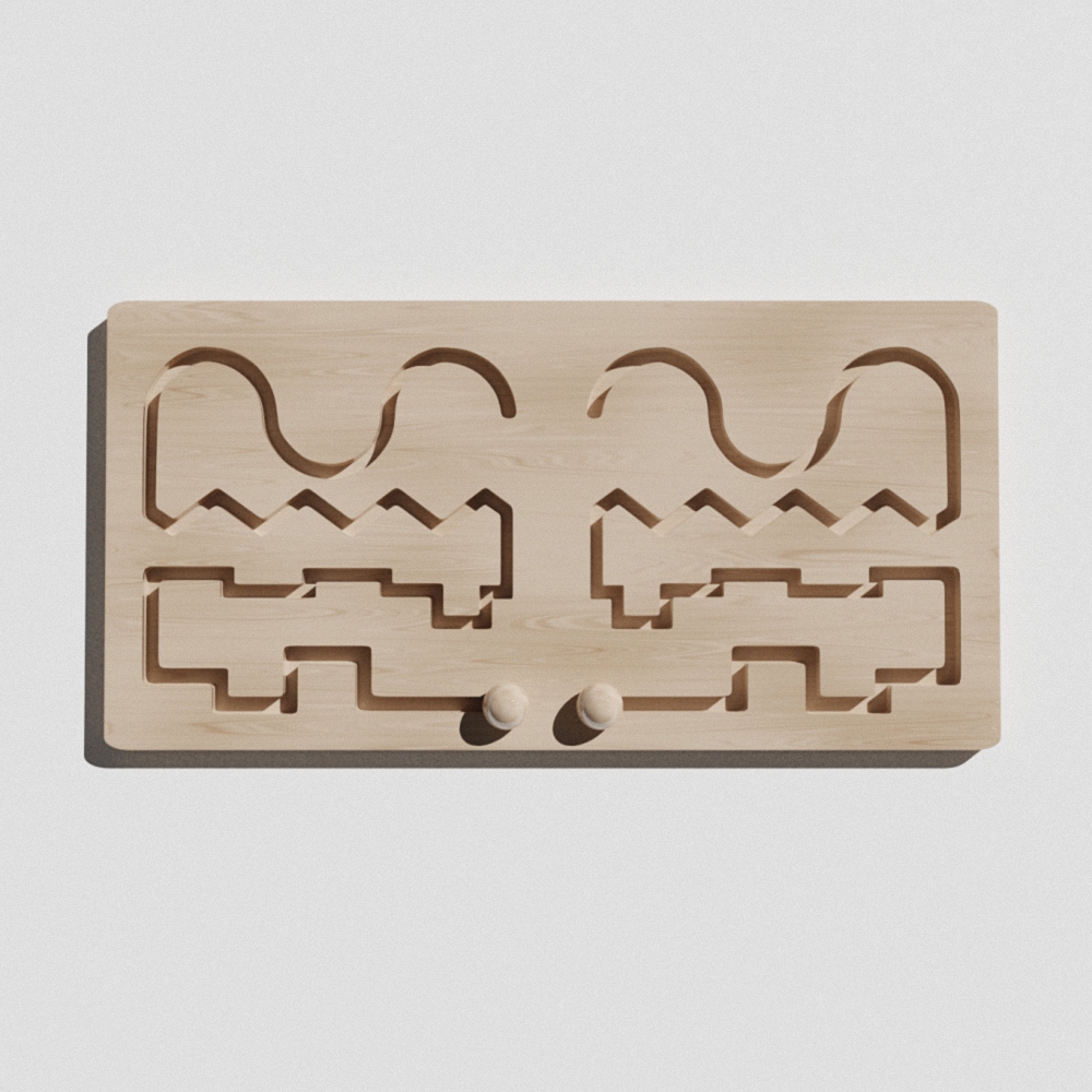 Малышу необходимо взять два бегунка и установить в лабиринте. Сначала двигать кружок по маршрут правой, затем только левой рукой, а после двигаться по траектории лабиринта обоими одновременно по часовой стрелке, а потом против. Упражнение помогает сформировать одновременную работу рук, глаз и обоих полушарий.