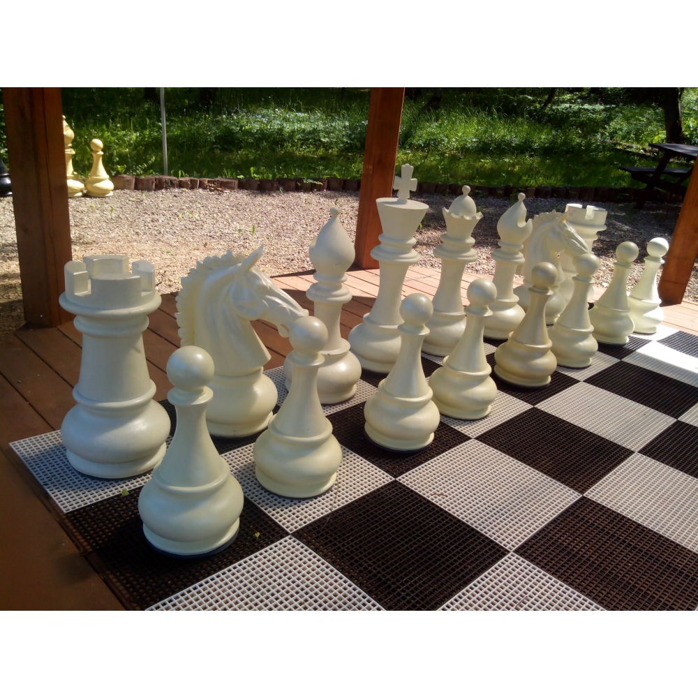 Напольные большие фигуры замечательно подходят для игры на улице. Они изготовлены из полиуретанового пластика высокого качества и окрашены специальным стойким покрытием, что позволяет им выдерживать любые погодные условия – фигуры не портятся от изменения температур, дождя ил повышенной влажности, а также не выгорают на солнце. Шахматные фигуры  выполнены из 2-х частей (в верхей части есть отверстие, позволяющее утяжелять или облегчать фигуры). Ими можно играть даже при сильном ветре.